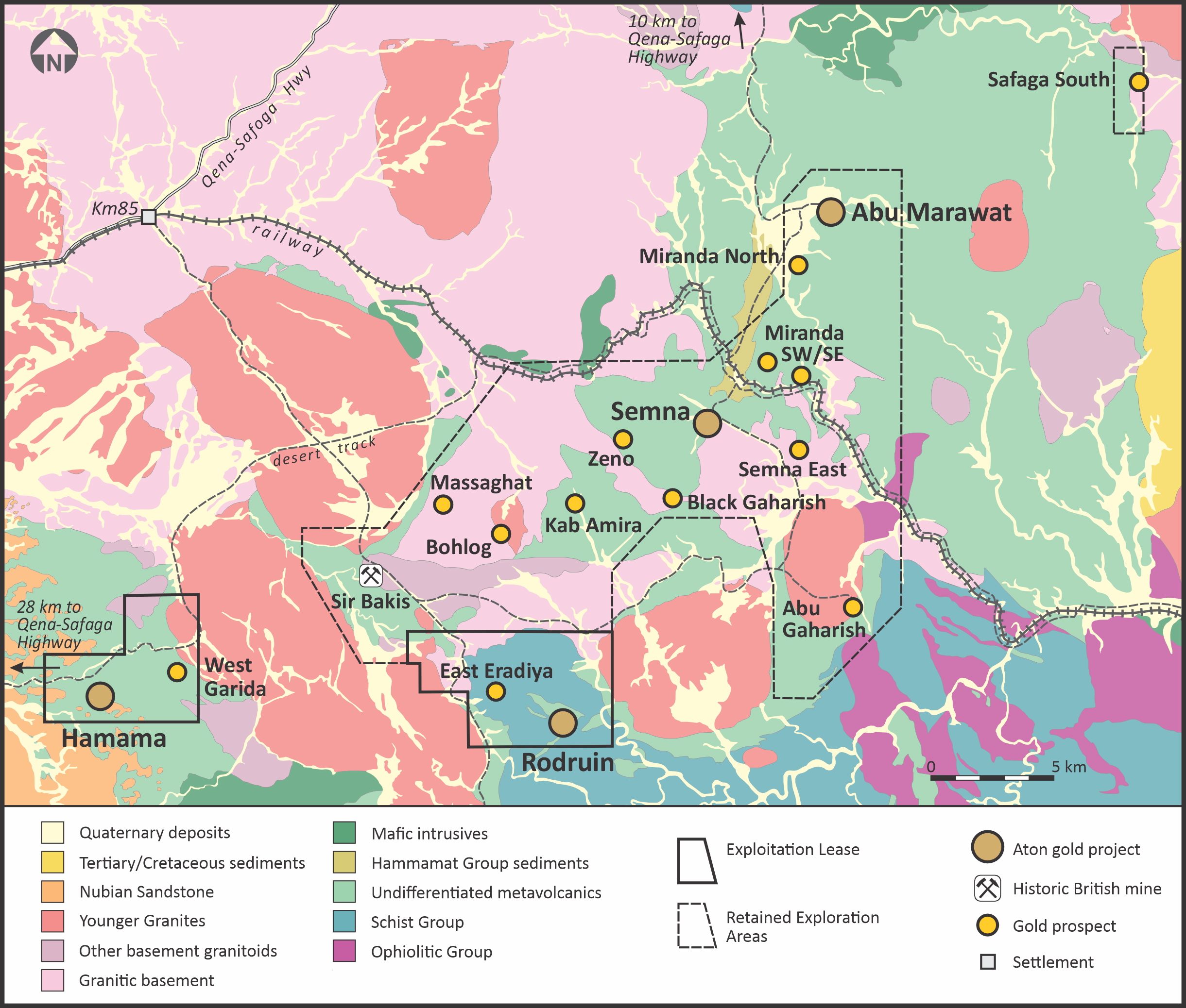 Aton Resources Inc. (AAN: TSX-V) is focused on its 100% owned Abu Marawat Concession (“Abu Marawat”), located in Egypt’s Arabian-Nubian Shield, approximately 200 km north of Anglogold Ashanti’s world-class Sukari gold mine. Aton has identified numerous gold and base metal exploration targets at Abu Marawat, including the Hamama deposit in the west, the Abu Marawat deposit in the northeast, and the Rodruin deposit in the south of the Concession. Two historic British gold mines are also located on the Concession at Semna and Sir Bakis. Aton has identified several distinct geological trends within Abu Marawat, which display potential for the development of a variety of styles of precious and base metal mineralisation. The Abu Marawat exploitation lease is 57.66 km2 in size, covering the Hamama West and Rodruin mineral deposits, and was established In January 2024 and is valid for an initial period of 20 years. The Concession also includes an additional 255.0 km2 of exploration areas at Abu Marawat, retained for a further period of 4 years from January 2024. Abu Marawat is located in an area of excellent infrastructure; a four-lane highway, a 220kV power line, and a water pipeline are in close proximity, as are the international airports at Hurghada and Luxor.