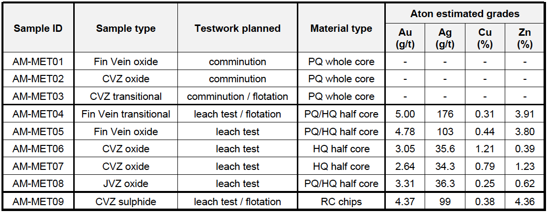The Au head assays measured by screen fire assay (Table 3) show reasonably good correlation with the estimated grade of the composited drill core samples (Table 1). Ag, Cu, Pb and Zn head assays also showed reasonable correlation with the estimated grades of the composite samples. The reasonably good correlation in assay results indicates that the composite samples prepared for metallurgical testwork are representative of the drill core intervals sampled. Samples AM-MET01 to AM-MET03 consisted of whole core and were selected on the basis of the visual identification of mineralisation, however, no grades could be estimated for these samples prior to their selection, collection and dispatch from site.