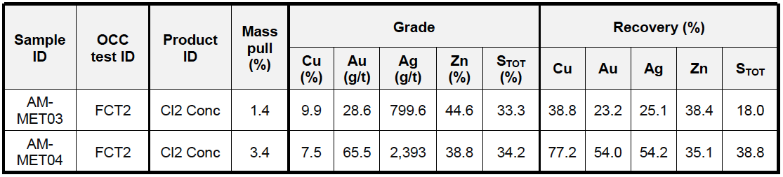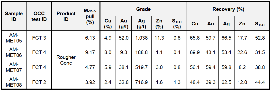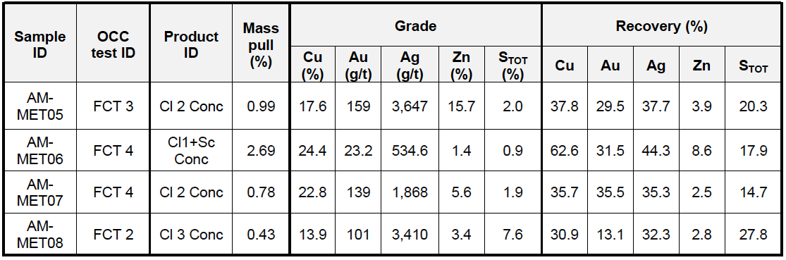 Results show that reasonable copper recoveries were obtained to the cleaner concentrate ranging from 30.9% to 62.6%, at cleaner concentrate grades ranging from 13.9% Cu to 24.4% Cu. The target was to achieve a saleable concentrate grade of 18-22% Cu, which was obtained for the Fin Vein and CVZ oxide mineralisation (samples AM-MET05 to AM-MET07), but not for the JVZ oxide mineralisation (sample AM-MET08). Even with 3-stage cleaning a cleaner concentrate grade of only 13.9% Cu was achieved for the JVZ oxide sample, AM-MET08.