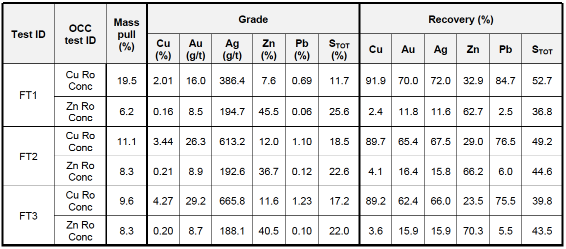Follow-up open cycle cleaner tests were conducted on the CVZ sulphide mineralisation adopting the optimal flotation parameters from the transitional ore OCC tests. Optimal results were achieved in FCT3. Results of the optimal OCC tests are summarised in Table 13 below.
