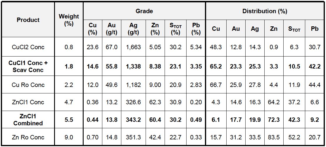 - Saleable copper and zinc concentrates were achieved during testing of the CVZ sulphide composite sample. The copper circuit achieved a concentrate grade of 23.7% Cu at 48.3% recovery, whilst the zinc circuit achieved a concentrate grade of 60.4% Zn at 72.3% recovery;