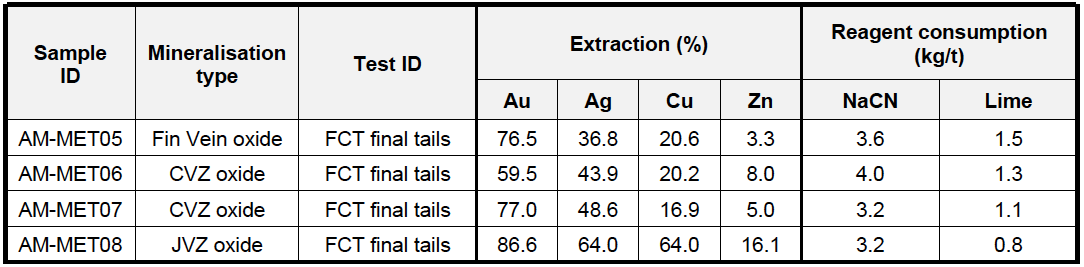 The results show sodium cyanide (“NaCN”) consumptions ranging from 3.2 kg/t in AM-MET09 to 9.2 kg/t in AM-MET02, and lime consumptions ranging from 0.6 kg/t in AM-MET04 to 12.0 kg/t in AM-MET06.