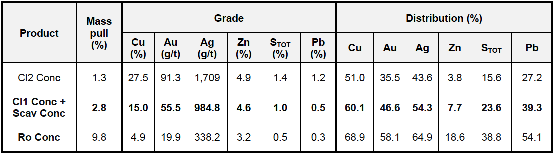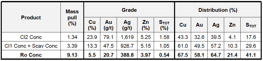 - High value copper concentrates containing significant silver credits are achievable, albeit with some recovery losses;