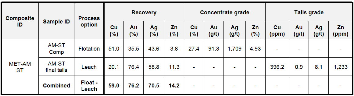The overall combined copper, gold and silver recoveries for the float-leach option were 59.0%, 76.2%, and 70.5% respectively. Overall metal recoveries for the float-leach option were higher than those achieved for the standalone leach option. This was mainly attributable to an increase in the free cyanide concentration for the leach test carried out on the AM-ST flotation tails.