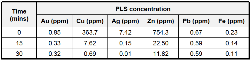 During stage 1 sulphuric acid is added to the PLS to decrease the pH down to 3-4. Limited testwork was undertaken to simulate stage 1 of a SART process. At this stage sodium hydrosulphide (“NaSH”) is then added to the solution to precipitate metal sulphides complexed with cyanide. Table 18 shows the PLS assays with time as the NaSH is added.
