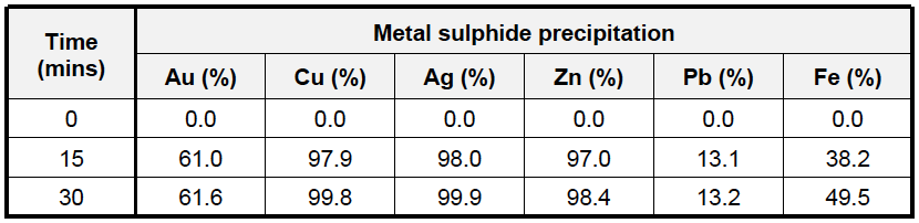 SART test filtrate assays indicate >97% precipitation of Ag, Cu and Zn within 15 minutes of NaSH addition. Further residence time had little effect on the degree of metal precipitation. Only Fe displayed a significant increase in precipitation, with a further 11.3% precipitated after 30 minutes.