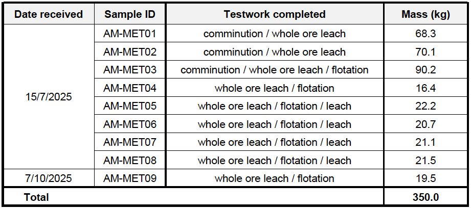 Aton dispatched the nine composite samples from Egypt, totalling 350 kg in weight, to SLR Consulting (“SLR”), for metallurgical testing at their laboratory, located in Cornwall, UK. The samples were delivered in two batches, with the initial set of eight diamond drill core samples weighing 330 kg dispatched to SLR during July 2025 (samples AM-MET01 to AM-MET08). Sample AM-MET09, weighing 19.5 kg, was dispatched from Egypt and received by SLR in October 2025. The testwork was conducted between July and November 2025.