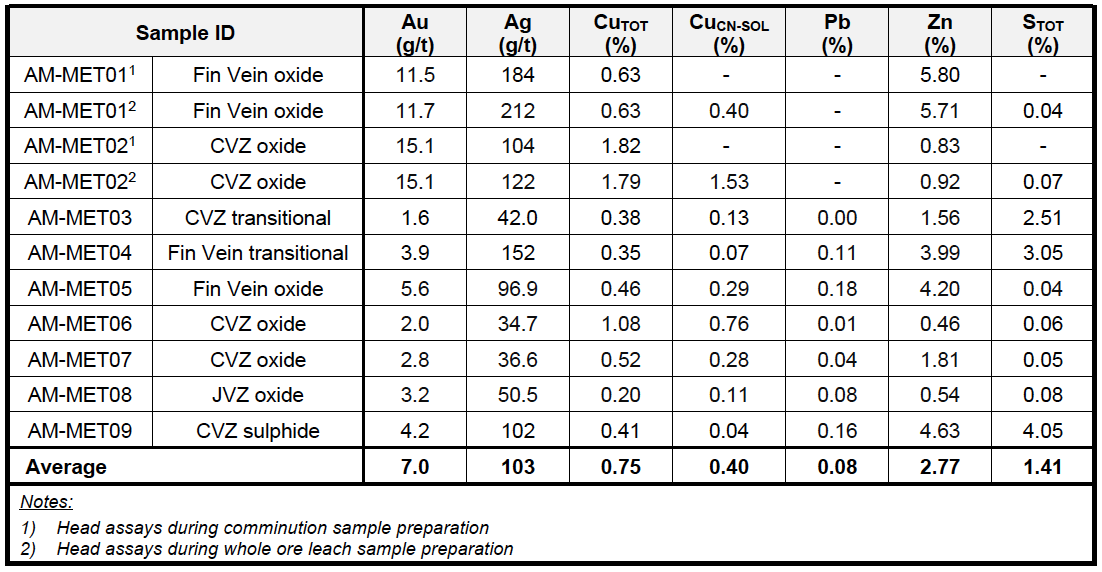 A representative sub-sample of composite samples AM-MET01 to AM-MET08, and latterly AM-MET09, were extracted, pulverised to <75µm and submitted for chemical analysis for the following elements; Au, Ag, total Cu (“Cu (TOT)”), soluble Cu (“Cu (CN SOL)”), Pb, Zn, As, total S (“S(TOT)”), Hg and Te. The results of the head assays are provided in Table 3.