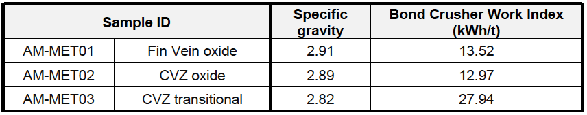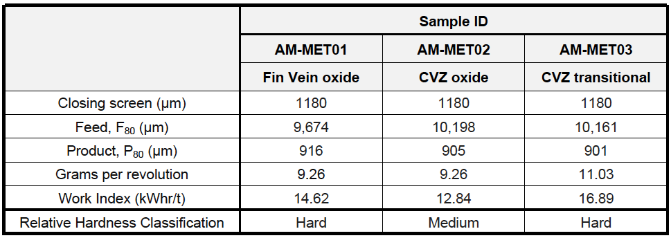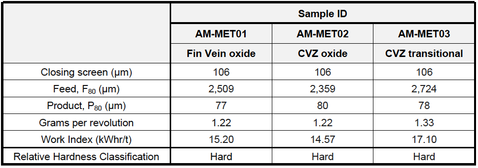 Bond Rod Mill Work index testing indicated that AM-MET01 and AM-MET03 samples are classified as “hard” and AM-MET02 is classified as being of “medium” hardness.