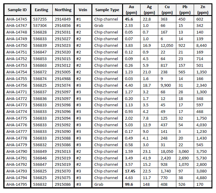 Vein #3 is the most intensely worked and although it can be traced for about 70m along strike (see Figure 2) no complete section is now visible. The mineralized structure appears to consist of a gently westward dipping shear zone with a wide alteration halo and a parallel quartz vein impregnated with earthy hematite, sericite and gold; copper minerals are scarce. It appears to dip at between 10° and 15° to the west, and the total thickness is uncertain, but possibly a metre or more. The vein is hosted mainly by coarse andesitic tuff breccias. Free gold is locally abundant in both the quartz vein and in the phyllic altered wallrock. The gold in the wallrock is always very fine grained, mossy and deep yellow while the gold in the vein quartz can be yellow to white (electrum) and grains can reach 1-2mm. Several channel samples were taken across the reasonably well exposed and altered shear zone and quartz lenses within it, which returned assays ranging up to 17.45g/t Au and 22.5g/t Ag (sample AHA-14793). A single grab sample taken from a poorly exposed vuggy quartz vein, containing abundant visible gold and electrum, returned assays of 99.6g/t Au and 148 g/t Ag (sample AHA-14795). Channel samples from the altered wallrock adjacent to the vein assayed up to 5.03 g/t Au (sample AHA-14776).
