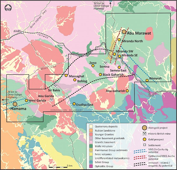 Aton Resources Inc. (AAN: TSX-V) is focused on its 100% owned Abu Marawat Concession (“Abu Marawat”), located in Egypt’s Arabian-Nubian Shield, approximately 200 km north of Centamin’s Sukari gold mine. Aton has identified a 40 km long gold mineralized trend at Abu Marawat, anchored by the Hamama deposit in the west and the Abu Marawat deposit in the east, containing numerous gold exploration targets, including three historic British mines. Aton has identified several distinct geological trends within Abu Marawat, which display potential for the development of intrusion related and orogenic gold mineralization, VMS precious and base metal mineralization, and epithermal-IOCG precious and base metal mineralization. Abu Marawat is over 738km2 in size and is located in an area of excellent infrastructure, a four-lane highway, a 220kV power line, and a water pipeline are in close proximity.