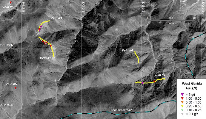 - Field inspection and sampling of the West Garida prospect has led to the identification of at least 6 gold mineralized quartz veins outcropping at surface;