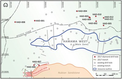 Holes HAD-005, 010, 011 and 012 were planned to test the potential for increasing sulphide resources on the eastern flank of the MZ at Hamama West. Today’s assay results confirm that potential. Holes HAD-006 and 007 were drilled towards the south, and tested the Crocs Nose Zone, south of the Main Zone (see Figure 2). The high grade intersection from hole HAD-007 extends the mineralization previously intersected in surface trench HAT-113 and holes AHA-045 and AHA-046 (see news release dated June 9, 2015) to the east. The mineralization at the Crocs Nose Zone has only had limited testing to date, and is interpreted as being a faulted offset of the Main Zone mineralization, which strikes under the Nubian Sandstone unconformity. This zone was not included in the Hamama West resource estimate (see news release dated January 24, 2017) and the new drilling results confirms the potential to delineate additional near surface resources in this area.
