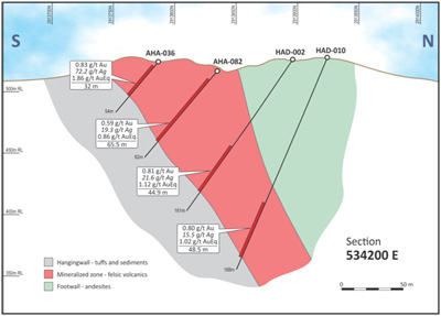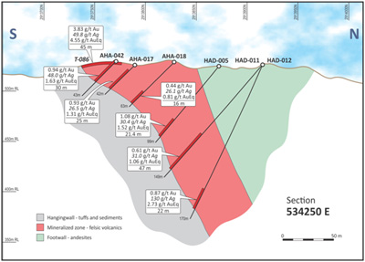 - Drill hole HAD-007 returned 28.0 metres of 2.84 grams per tonne g/t AuEq, including 4 metres of 6.05 grams per tonne gold and 376 grams per tonne silver, from the Crocs Nose Zone, which is not included in the existing mineral resource estimate (see Figure 2).