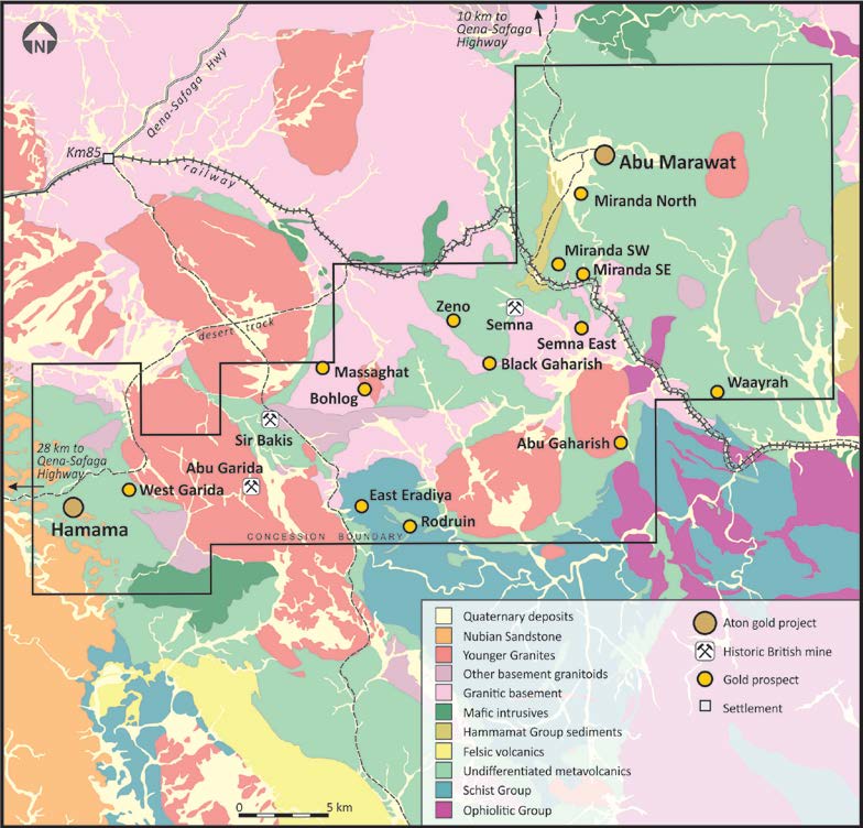 Aton Resources Inc. (AAN: TSX-V) is focused on its 100% owned Abu Marawat Concession (“Abu Marawat”), located in Egypt’s Arabian-Nubian Shield, approximately 200 km north of Centamin’s Sukari gold mine. Aton has identified a 40 km long gold mineralized trend at Abu Marawat, anchored by the Hamama deposit in the west and the Abu Marawat deposit in the east, containing numerous gold exploration targets, including three historic British mines. Aton has identified several distinct geological trends within Abu Marawat, which display potential for the development of RIRG and orogenic gold mineralization, VMS precious and base metal mineralization, and epithermal-IOCG precious and base metal mineralization. Abu Marawat is over 738km2 in size and is located in an area of excellent infrastructure, a four-lane highway, a 220kV power line, and a water pipeline are in close proximity.