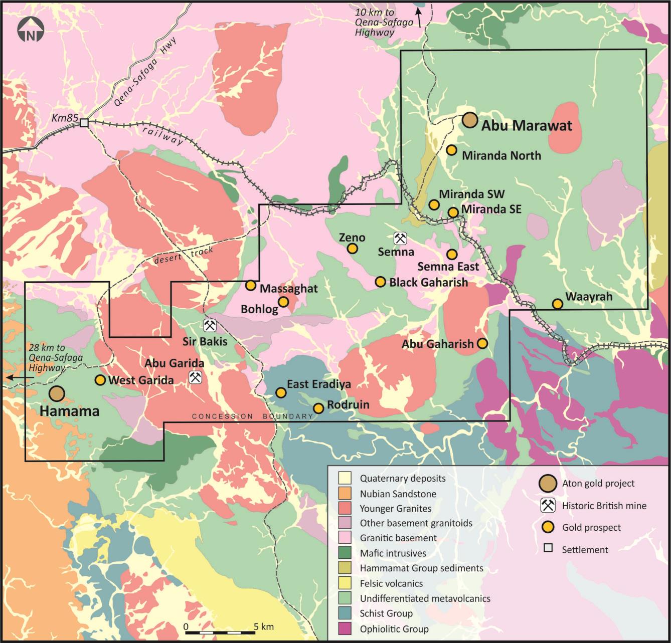 Aton Resources Inc. (AAN: TSX-V) is focused on its 100% owned Abu Marawat Concession (“Abu Marawat”), located in Egypt’s Arabian-Nubian Shield, approximately 200 km north of Centamin’s Sukari gold mine. Aton has identified a 40 km long gold mineralized trend at Abu Marawat, anchored by the Hamama deposit in the west and the Abu Marawat deposit in the east, containing numerous gold exploration targets, including three historic British mines. Aton has identified several distinct geological trends within Abu Marawat, which display potential for the development of RIRG and orogenic gold mineralization, VMS precious and base metal mineralization, and epithermal-IOCG precious and base metal mineralization. Abu Marawat is over 738km2 in size and is located in an area of excellent infrastructure, a four-lane highway, a 220kV power line, and a water pipeline are in close proximity.