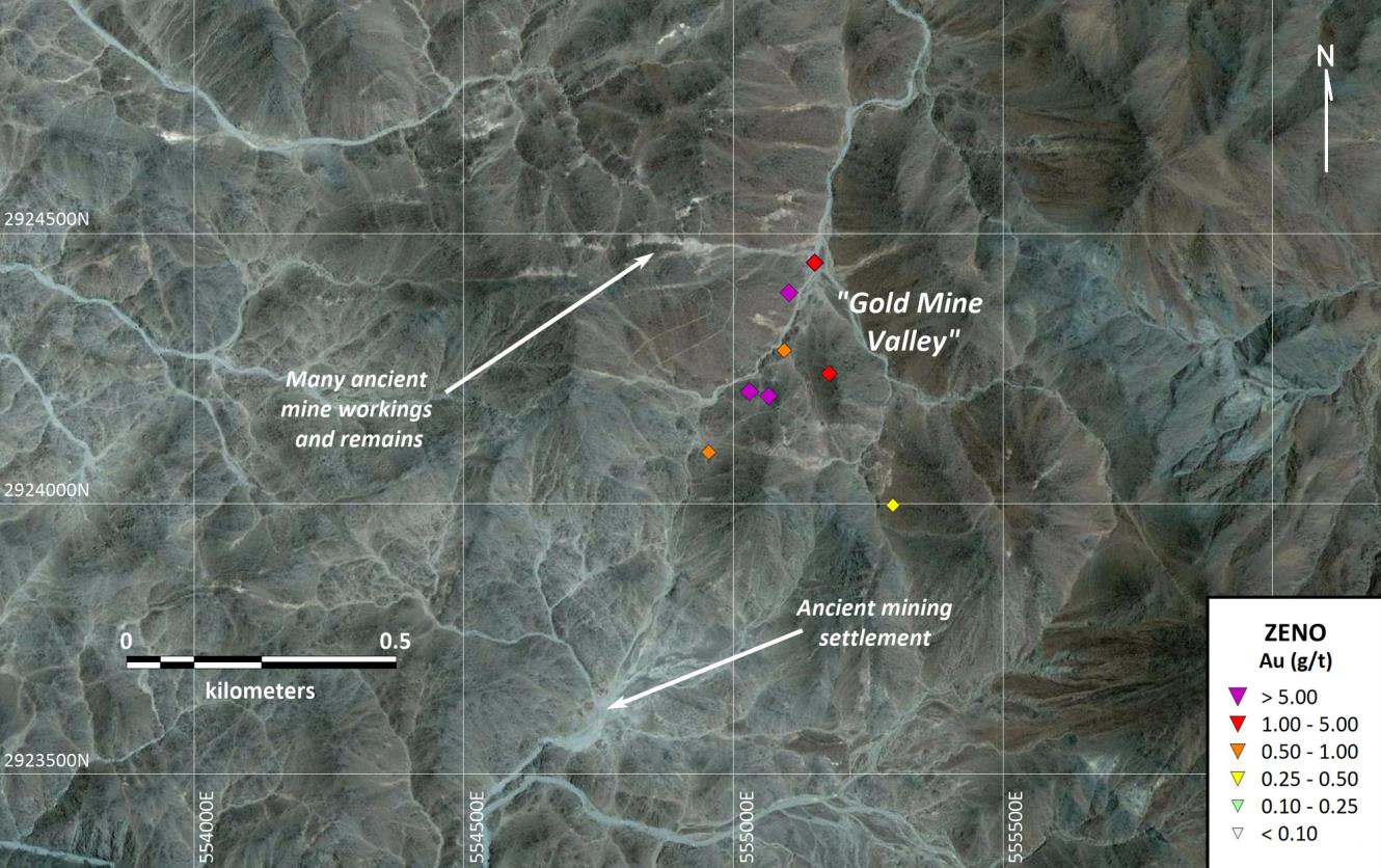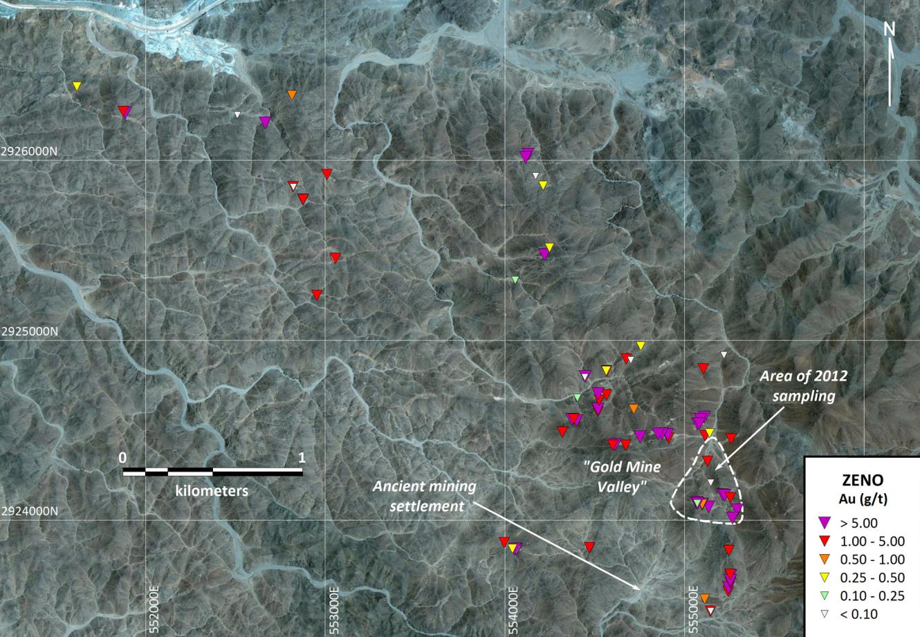 - Results of this sampling program confirm the widespread occurrence of quartz vein hosted gold mineralization in the Zeno prospect area, carrying potentially significantly high grades of gold.