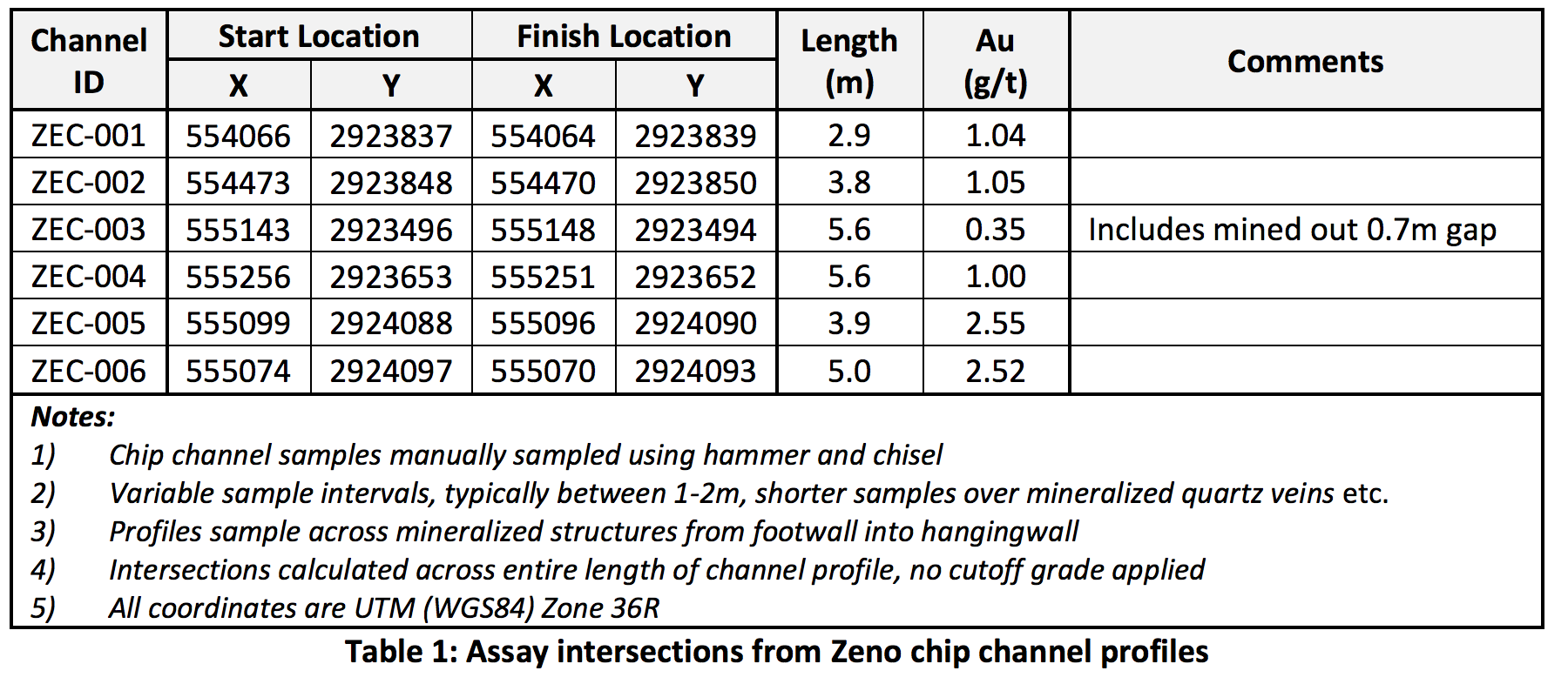 All the channel profiles were mineralized, and assay intersections across the mineralized structures included 5.0 m @ 2.52 g/t Au (channel profile ZEC-006) and 3.9 m @ 2.55 g/t Au (ZEC-005).