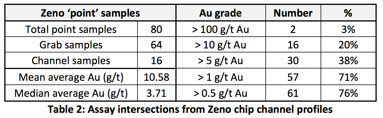 A total of 80 ‘point’ samples were collected, of which were 64 samples were grab or grab composite samples, with 16 individual channels sampled over lengths varying between 0.4 - 2.2 m. 18 of the point samples were collected underground from ancient workings. Full details of the point samples from Zeno are provided in Appendix A, and a summary of the point sample results is presented below in Table 2: