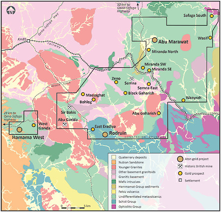 The Safaga South prospect is located at the northeastern corner of the Abu Marawat Concession, on the southern side of Wadi Safaga, and is approximately 14 km east-northeast of the Abu Marawat deposit. Mineralised quartz veins have been identified on the ground over an area of several square kilometres, and have been partially worked in ancient times (see Figure 2). There is also archaeological evidence of ancient dwellings and alluvial wadi workings in the surrounding area. Aton has not been able to locate any previous record of this apparently unknown historical mining site.