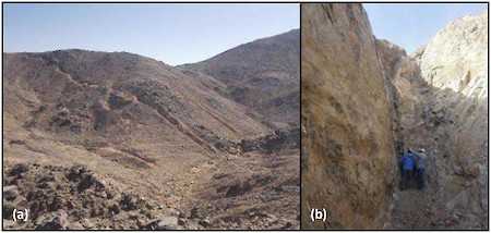 Figure 2: Safaga South prospect. (a) ancient workings on approximately E-W trending quartz veins, and (b) Aton geologists examining a previously mined quartz vein