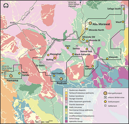 Aton Resources Inc. (AAN: TSX-V) is focused on its 100% owned Abu Marawat Concession (“Abu Marawat”), located in Egypt’s Arabian-Nubian Shield, approximately 200 km north of Centamin’s world-class Sukari gold mine. Aton has identified numerous gold and base metal exploration targets at Abu Marawat, including the Hamama deposit in the west, the Abu Marawat deposit in the northeast, and the advanced Rodruin exploration prospect in the south of the Concession. Two historic British gold mines are also located on the Concession at Sir Bakis and Semna. Aton has identified several distinct geological trends within Abu Marawat, which display potential for the development of a variety of styles of precious and base metal mineralisation. Abu Marawat is 447.7 km2 in size and is located in an area of excellent infrastructure; a four-lane highway, a 220kV power line, and a water pipeline are in close proximity, as are the international airports at Hurghada and Luxor.