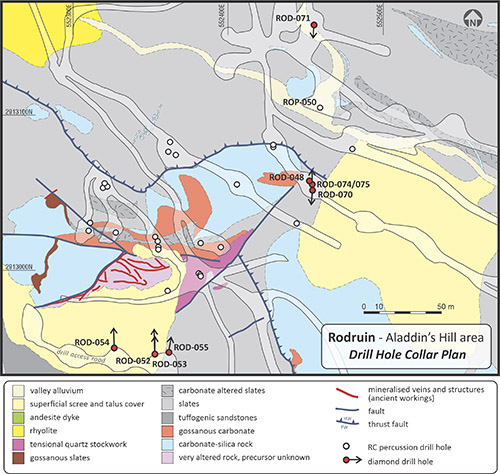 Both holes ROD-048 and ROD-070 intersected gold-silver-zinc mineralisation immediately from surface, with ROD-048 returning 2.21 g/t Ag, 6.8 g/t Ag and 5.98% Zn over 17m (see news release dated January 29, 2019), and ROD-070 returning 4.21 g/t Ag, 14.6 g/t Ag and 1.64% Zn over 5.7m, in gossanous carbonate host rocks. Hole ROD-070 passed into unmineralised sediments above and below the SRT, and did not intersect further mineralisation below 20m depth. Hole ROD-048 also intersected several deeper zones of mineralisation including 1.07 g/t Au and 15.7 g/t Ag over 17.1m, from 116.7m downhole depth, in a sulphide-rich carbonate-silica-talc unit.
