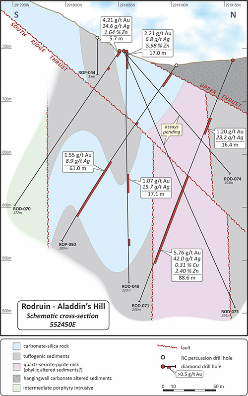 The heavily phyllic altered unit that hosts the mineralised intersection is fault-bounded to both the south and the north, and also above by the South Ridge Thrust (“SRT”), a prominent structural feature which outcrops along the south side of the South Ridge and which dips to the north at about 40°. Hole ROD-071 intersected a separate sequence of heavily foliated quartz-sericite-pyrite rock above the SRT, which also returned a mineralised intersection grading 1.20 g/t Au and 23.2 g/t Ag over 16.4m, from 58.9m down hole on its northern faulted margin.